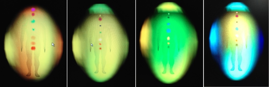 由左至右分別是:原始氣場、握持稀釋至純水6天的花精、握持稀釋至純水3天的花精、握持原液。